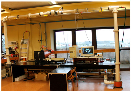 The experimental setup applied for testing two-phase mixture flows (see Figure 1) comprised a system of PVC pipes with a diameter of 78 mm. The experimental stand includes water and air supply systems (Figure 2). The air supply system consists of an expansion tank with a capacity of 4 m3 and a pressure of 0.8 MPa, a ball cut-off valve for the air supply, a pressure gauge applied for reducing the pressure to 0.5 bar. Downstream of the regulator there is a control valve that provides air flow rate regulation. The flow rate of air routed into the system is measured using a differential pressure flow meter which takes the form of a standard orifice.