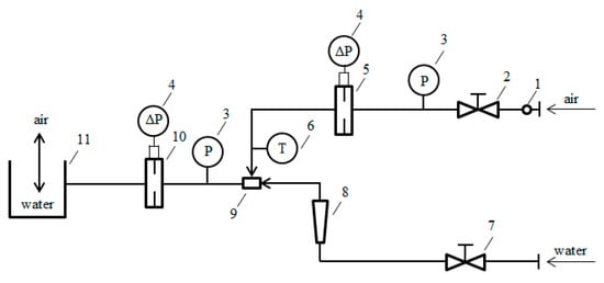 Diagram of experimental setup applied for research of flow rate of two-phase mixture: 1—pressure gauge applied to regulate air flow rate to 0.5 bar, 2—air flow rate regulation valve, 3—overpressure sensor, 4—differential pressure transducer, 5—differential pressure flowmeter applied for air flow measurements (standard orifice), 6—air temperature sensor, 7—water flow rate regulation valve, 8—water flow rate rotameter, 9—spray nozzle, 10—differential pressure flowmeter applied for two-phase flow mixture measurements (set of removable standard orifice and slotted orifices, 11—phase separator.