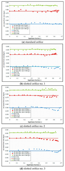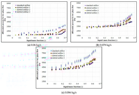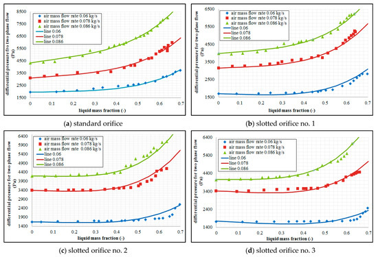 Figure 4 shows the results of an experiment carried out for three selected air flow rates in conditions characterized by a variable mass fraction of water. The analysis is concerned with the effect of mass fraction of water depending on the gas flow rates for selected types of orifices. On the basis of the analysis of the above figures, we can note that the presence of liquid in the gas flow results in the variations of the pressure difference developed at the orifice. We can see that the differential pressure occurring at the orifice increases along with the increase of the liquid mass flow in the conditions marked by a constant air flow rate. When an analysis of the graphs is undertaken, greater air flow rates lead to greater value in terms of the differential pressure. This tendency is recorded for each of the investigated orifice plates. The conducted experiments concerned with two-phase mixture flow across specific orifice design have demonstrated that the tested slotted orifices designs generate smaller differential pressure in relation to the standard orifice. We can see that slotted orifices no. 2 and 3 are much less sensitive in this respect. In comparison to the standard orifice, the slotted orifices demonstrate a considerably greater stability in terms of the results of measurements compared to the use of the standard orifice. On the basis of the graphs presented in Figure 4, we can see that the variations in the differential pressure depending on the mass share of the liquid in the mixture assume non-linear characteristics.