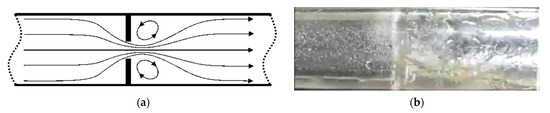 Over the years, research has been conducted on various differential pressure flowmeter designs that could offer the possibility of reliable measurements of the flow rates of multi-phase mixtures. The directions of available studies include slotted, perforated, fractal orifices as well as orifices with different designs of holes (square, triangle, oval) [9,10,11,12,13,14]. Individual researchers supervised by Morrison, including Macek, Ihfe and Brewer, conducted experiments into the performance of slotted orifices in the conditions of single-phase as well as two-phase gas-liquid flow. These experiments demonstrated that the use of the slotted orifice leads to the homogenization of the two-phase flow when it is compared with the standard orifice. Ihfe investigated the effect of varying the porosity of the orifice along the radius of the tube and found that it is possible to obtain a fully developed flow over a short distance. The study by Macek demonstrated that the slotted orifice generates lower differential pressure and provides faster pressure recovery behind the orifice in comparison to the standard orifice [15,16,17]. Annamalai et al. [18] focused on the phenomena of homogenization of the two-phase mixture behind an orifice. In this study it was demonstrated that it is possible to apply a slotted orifice as a stream stabilizer due to its capability to transform a majority of flow structures into a homogeneous mixture. The tests examined how the homogeneity of the two-phase gas/liquid mixture varied depending on the use of the slotted orifice in a horizontal pipe for various conditions before the orifice.