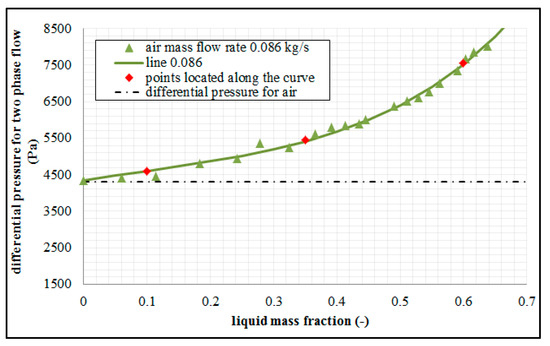 Figure 7 contains the results of the dependence of the differential pressure on the mass fraction of liquid for the constant mass air flow rate of equal to 0.086 kg/s. The dashed line indicates the differential pressure value for dry gas.