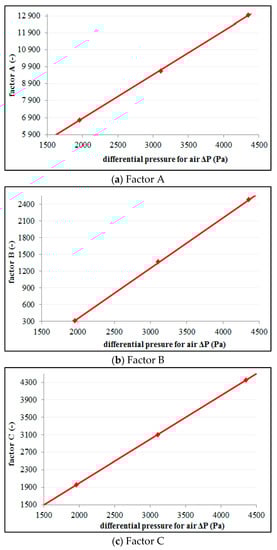 Figure 9 contains details of the comparison of the results of the calculated differential pressure ΔpTP derived on the basis of the relationship (19) with the data with regard to the differential pressure ΔpTP,experiment derived from experiments. This set of data refers to three different constant air flow rates and all orifice designs.