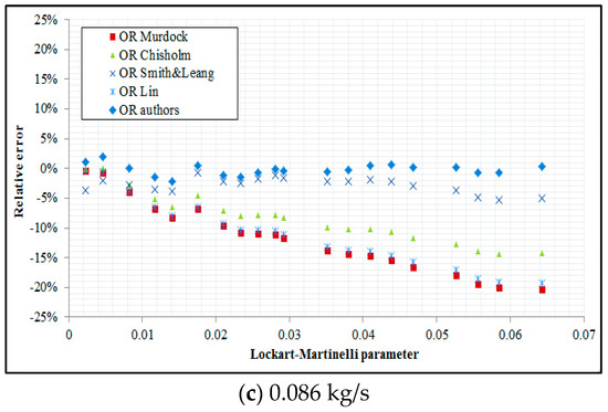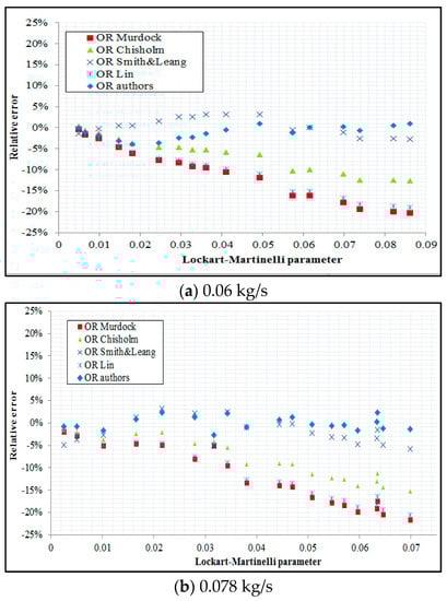 On the basis of an analysis of the above figures that relate to three different air flow rates, we can see that among the OR models available in the literature, the greatest level of conformity with the results of this research was obtained by application of Smith and Leang correlation. In the case of this correlation, the mean square error was in the range of around 3–5% for all three tested constant air flow rates. Using the Chisholm OR correlation, the relative error assumed a maximum of around 15%. The root mean square relative error resulting from applying the Murdock and Lin correlation is equal to approximately 19–21%. When the OR developed in this study was applied, the root mean square relative error was found to be 0.9–1.8%.