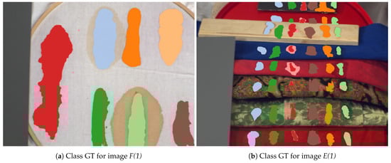 Images in the dataset were captured using a SOC710 hyperspectral camera operating in the spectral range of 377–1046 nm with 128 bands. Two types of images were used in our experiments: the “Frame” images, denoted as F in [], which present classes on a uniform, white background; and the “Comparison” images (denoted as E), which present classes on diverse backgrounds consisting of multiple materials and fabrics.