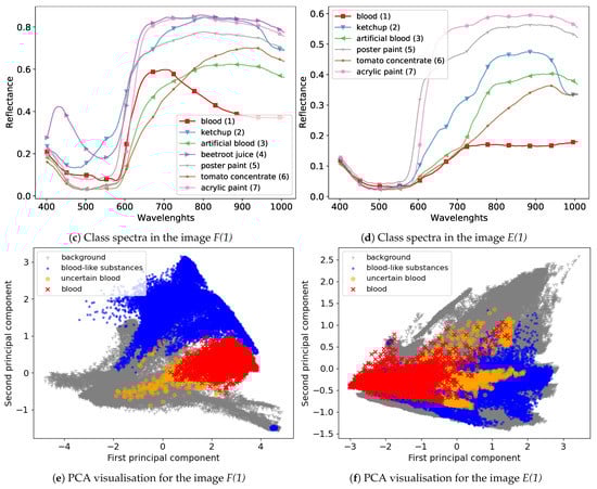 We used images captured on days . Following the convention from [], we denoted the day of acquisition after the scene name in brackets; e.g., F(1) for the scene “Frame” from day 1. The visualisation of the dataset is presented in Figure 1. Figure 1a,b presents the acquisition scenes for two selected images with marked pixels of different substances used during further experiments. Their mean spectra are presented in Figure 1c,d, while Figure 1e,f shows two components of the PCA projection. It is possible to observe that pixels marked in the F(1) image as “uncertain blood” have similar values of principal components to background pixels, while in the case of the E(1) image, “uncertain blood” is more similar to “blood-like substances”. Furthermore, spectra of different classes on the F(1) image are more diverse than in the case of the E(1) image, where pixels of various substances overlap according to the PCA projection.