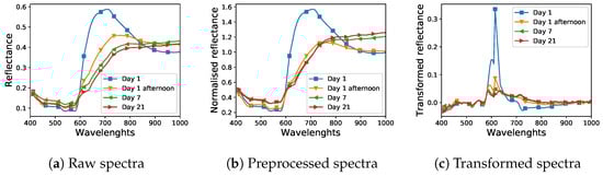 A visualisation of the impact of preprocessing and feature extraction on example spectra is presented in Figure 2. Figure 2a,b presents the reflectance spectra of blood for different days after spilling, without and with the division of each pixel by its median value, respectively, while Figure 2c shows spectra after calculating first-order derivatives.