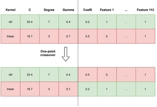 Figure 3 shows an example crossover between two individuals (i.e., classifiers). We observed that high probabilities of crossing and mutation had a positive effect on the search space; i.e., they allowed the search space to be better explored and for more solutions to be checked, reducing the chances of finding a locally optimal solution []. Thanks to the elitist strategy, there is a certainty that the best individual found will not be lost. The mutation of an individual consists in the modification of a single gene in the chromosome. If it is a gene responsible for a parameter of the SVM, its value is replaced by the new value of the given parameter from the set range (acceptable values are shown in Table 1). If we draw a gene that represents a feature, its value is replaced by the opposite one; e.g., from “not selected” (0) to “selected” (1). Values of our genetic algorithm parameters are presented in Table 2.