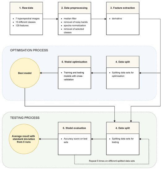 - Data preprocessing—Data were transformed in accordance with the methodology described in Section 3.2: in order to reduce the effect of noise and uneven lighting, spectra were smoothed with the median window, normalised and noisy bands were removed. Background (unannotated pixels) and pixels from the class “beetroot juice” (class 4) that was not present in all images were removed. Finally, the problem was posed as a six-class classification with classes .