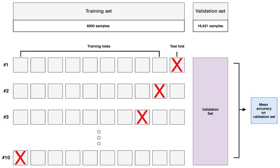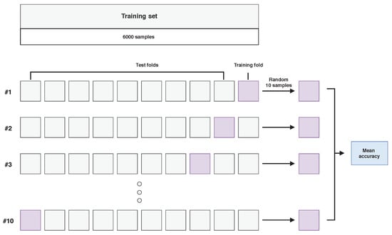 The training set contained 6000 examples (250 examples from each class, from four available images). Models were trained using 10-fold cross-validation, as presented in Figure 6. Nine folds formed a training subset, and the model was tested on a validation set. The remaining fold was not involved in the validation process.