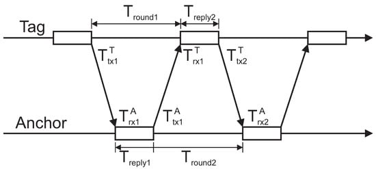 For distance measurements, the double-sided two-way ranging version with four messages is implemented on the UWB modules []. Implemented ranging method reduces error due to the clock drift on both devices and does not require symmetrical reply delays. The scheme (Figure 3) represents one ranging cycle required for calculating the distance, where the tag initiates the ranging and all the timestamps are obtained on the tag’s side with the fourth packet.