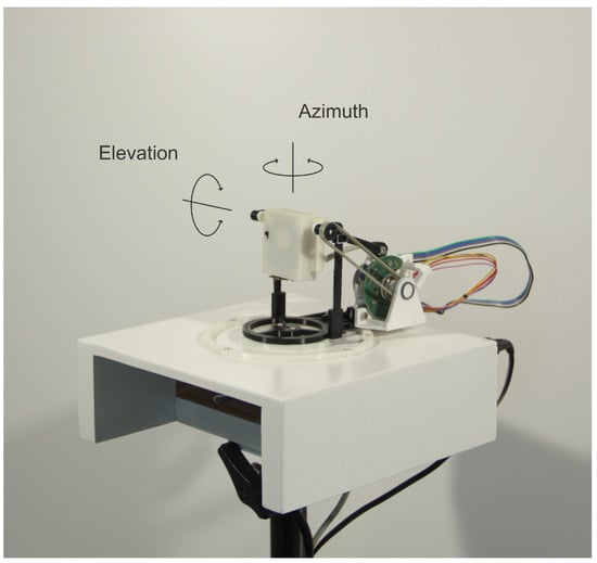 For collecting the training dataset needed for the NN’s training, the gimbal was designed (Figure 4). The gimbal enables the rotation of the UWB module around the azimuth and in the elevation plane relative to the antenna center with the USB cable connected to the module for the power supply and data transfer. For axis positions, two absolute rotary encoder RLS Orbis were used. To minimize the volume of any material around the UWB antenna, an elevation motor was placed behind the module, as low as possible. The motor is then connected to the gimbal axis via a timing belt. Position control is implemented on a microcontroller and can be driven with a PC over a USB cable.