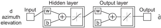 Measured and reference distances, azimuth and elevation angles were then used for the training of a feedforward neural network. The Matlab Deep Learning Toolbox was used to design and train the model. A feedforward neural network with six neurons in the hidden layer was chosen, with hyperbolic tangent sigmoid transfer function in the hidden layer and linear transfer function in the output layer (Figure 6). The process of choosing the number of neurons in the hidden layer is described in the result section.