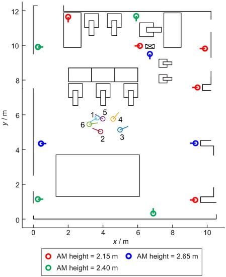 Real-time localization system (RTLS) setup in the laboratory with 12 anchors and 6 tag poses. The position for each pose is represented by a circle and the orientation with a short line. The short line represents the UWB zero-degree orientation. The same is valid for the anchors. The additional elements in the figure are other objects in the laboratory. AM heights in the legend describe the height of the anchor from the floor.