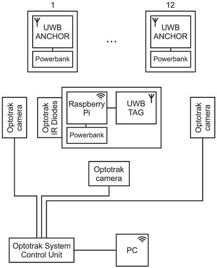 The anchors communicate with the tag only wirelessly, so just a power connection is provided to them with power banks (Figure 8). The tag is connected to a Raspberry Pi for the power and data transfer. The measured values are sent to the Raspberry Pi, where all the calculations are made. On the Raspberry Pi, a server is established so that the measured data can be transferred to a PC with Matlab Simulink. The Optotrak reference-position points are also acquired over a Simulink in the same scheme, so data synchronization is ensured at the data-acquisition level.