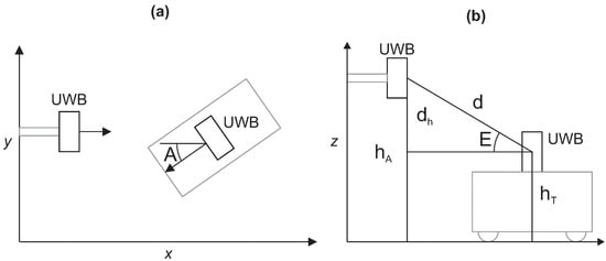 Tag’s azimuth and elevation relative to the individual anchor–tag pair. (a) The azimuth is computed from the anchor’s known orientation and the measured tag’s orientation around the z-axis in the reference coordinate system. (b) The elevation is obtained from the known heights of the anchor and tag and the distance between them.