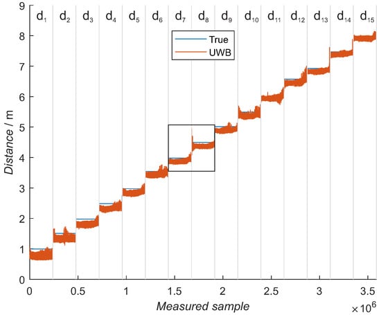 Training dataset with 15 different distances. For each distance, 33 azimuth and 29 elevation points were measured, and for each point, 250 samples were measured. The blue line represents the reference distance. Each distance between the UWB modules is separated with gray vertical lines. The black rectangle shows zoomed distances presented in separate figures.