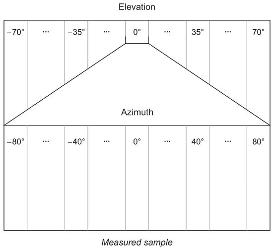 Presentation of the measured training data inside one distance between the UWB modules. The elevation was changing from −70 degrees to 70 degrees with a step size of 5 degrees, with the central position at 0 degrees. The azimuth was changing from −80 degrees to 80 degrees with a step size of 5 degrees, with the central position at 0 degrees inside each constant elevation.