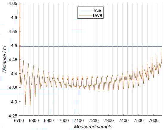 The trained NN model for the distance correction was evaluated experimentally with the RTLS in the laboratory. In this case, for the reference distances between the anchors and the tag, the reference system Optotrak Certus and geodetic measurements were used. With Optrotak Certus, the tag’s reference position and orientation were measured with three-point markers attached to the tag. The uncertainty of the position measurements after multiple Optotrack cameras were registered was less than 1 mm.