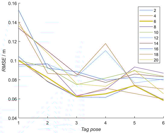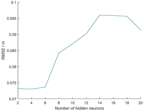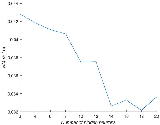 The optimal number of hidden neurons was determined experimentally. Ten different NN model configurations with the number of hidden neurons from 2 to 20 in increments of 2 were trained 10 times. For each NN model out of 100 and each tag pose, the RMSE was calculated using measured distances from the RTLS experiment. The NN model with the minimal average RMSE was selected for each number of hidden neurons from 10 trained NN models, obtaining the best NN model for each configuration (Figure 14). Then, from previously selected best-NN models for each configuration, the average RMSE for all the tag poses was computed for selecting the best NN model configuration (Figure 15 and Table 3 top row). In Figure 14, the RMSE is presented for each tag pose. In Figure 15, each number of hidden neurons is presenting an average of all six tag-pose RMSE values.