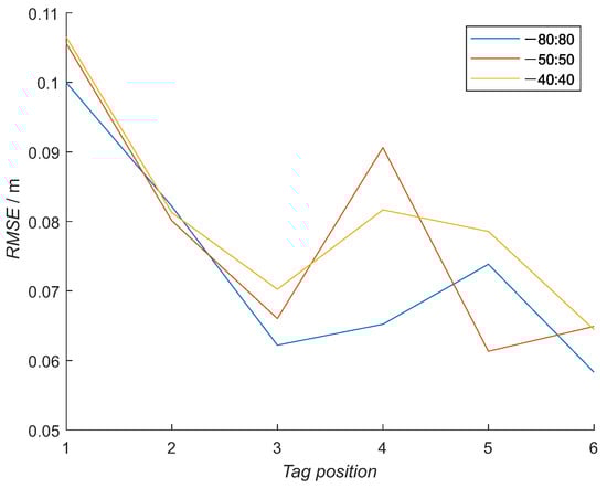 RMSE for all six tags’ poses with reduced training data for the neural network. From original −80 to 80-degree elevation span, two smaller data sets were made: from −50 to 50 and from −40 to 40-degree elevation span.