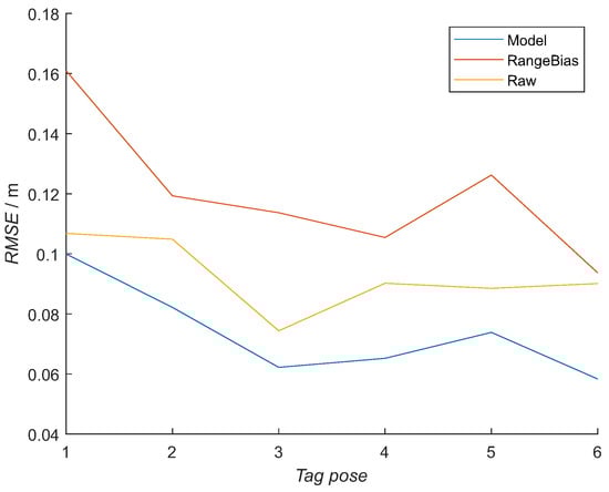 RMSE error for distances to all 12 anchors in the RTLS realistic setup in a laboratory for all six tags’ poses for the presented model (Model), a method that does not include orientational information (Range Bias) and raw measurements (Raw).