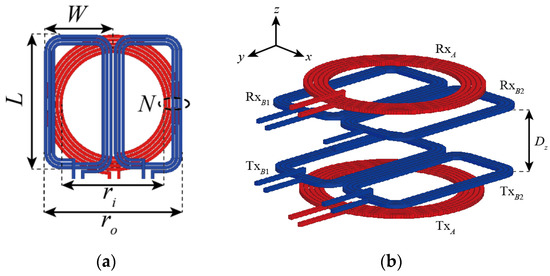 Configuration of: (a) 2 × 1 multilayer coil; (b) symmetric wireless power transfer (WPT) coil system based on proposed multilayer coils.