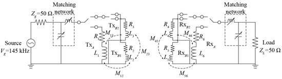 Figure 2 shows the equivalent circuit of a wireless power transfer system, based on the proposed multilayer coils in a 2 × 1 configuration. For simplicity, a symmetric system is assumed in which the Tx and Rx coils are identical.