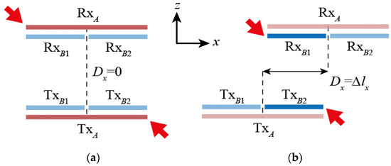 The basic principle of the stacked coil technique is depicted for an example 2 × 1 array assistant coil, as shown in Figure 3. The technique compensates for the lateral misalignment by operating the coils with the best alignment state, in a certain misalignment state, among the total of nine Tx/Rx coil pairs, which are possible combinations of the Tx/Rx coil stacks consisting of a total of three coils (one primary coil and two assistant coils). For example, when the Tx/Rx coil stack is properly aligned, as shown in Figure 3a, the alignment between the TxA and RxA, the primary coils of two coil stacks, is ideal; therefore, the power is transmitted by switching these coils. Naturally, in this case, the alignment is also good between an assistant coil pair TxB1 and RxB1, or TxB2 and RxB2, but because the assistant coil is less efficient than the primary coil due to its smaller size [15], it is best to switch TxA and RxA.