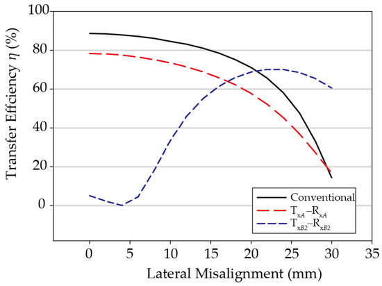 As shown in Figure 3b, if the misalignment occurs in the +x direction, and the alignment state between TxB2 and RXB1 is better than between TxA and RxA, the efficiency drop due to the misalignment between the coil stacks can be compensated by switching these two coils. Furthermore, the misalignment occurring in the –x-axis direction can be compensated by switching the TxB1 and RxB2 coil pair, since the assistant coil array is 2 × 1. Much larger misalignment may occur, and the alignment state may be good for not only the TxA and RxA coil pair, but also the TxBi and RxBi (i = 1, 2) coil pair. In this case, it is generally most efficient to switch the TxA and RxA coil pair, which has the largest coil size.