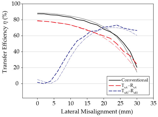 On the other hand, in the case of a pair of assistant coils in the Dx = 0 mm state, the efficiency is low because the misalignment is large. As the misalignment Dx increases, the alignment between these two assistant coils improves, and therefore the efficiency between the two assistant coils increases gradually. If the degree of misalignment increases to Dx = 23 mm, TxB2 and RxB1 are perfectly aligned, and in this instance, the transfer efficiency is maximized to 70.2%.