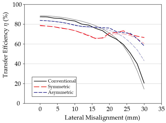 Because the assistant coil has been removed from the Rx coil stack in the asymmetric system, the distance between the primary coil pair TxA and RxA is reduced to maintain the vertical distance between the Tx and Rx coils at 7 mm. In other words, the distance between the primary coil pair decreases from Dz = 11.5 mm to 9.23 mm in the symmetric system. Therefore, the efficiency between the primary coil pair increases, and because the assistant coil has been removed, the effect of the Eddy currents decreases, which leads to an additional increase in efficiency. Hence, in the experimental results, the maximum transfer efficiency of the asymmetric system in the perfectly aligned state Dx = 0 mm is 83.8%, which is 4.9%P higher than that of the symmetric system. This indicates that the difference from the conventional system without the application of the multilayer coil technology is reduced by 3.7%P in the perfectly aligned state.