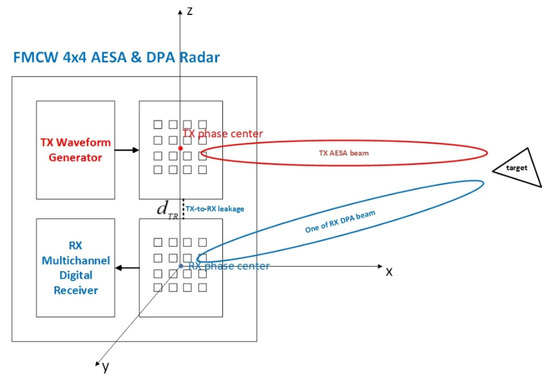 The active electronically scanned array (AESA) transmitter and the digital phased array (DPA) receiver with separate transmitter (TX) and receiver (RX) antenna panels. Both the TX and RX antenna panels have four-by-four element phase arrays. The RX and TX antenna phase centers are plotted as blue and red dots, respectively. The distance between the TX and the RX phase centers is. The origin of the radar coordinate system is located at the RX phase center.