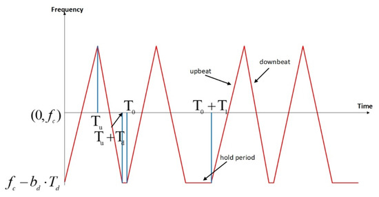 The proposed waveform has two time phases, i.e., phase 0 and phase 1. Phase 0 has a duration of and consists of a triangular frequency sweep (the upbeat and the downbeat) and a frequency hold period. Note that the upbeat and downbeat can have different chirp rates but the same frequency sweep range. Similarly, phase 1 has a duration of and consists of an identical triangular frequency sweep and a frequency hold period with a longer duration than the hold time of phase 0. This waveform is periodic with a period of which is the PRI of the FMCW radar. Essentially, it performs non-uniform sampling of the Doppler signature of the moving target [37]. There can be many different implementations of the non-uniform sampling scheme for the FMCW waveform. For example, the hold periods can be replaced by arbitrary functions. The proposed one is simple but very practical for implementation.