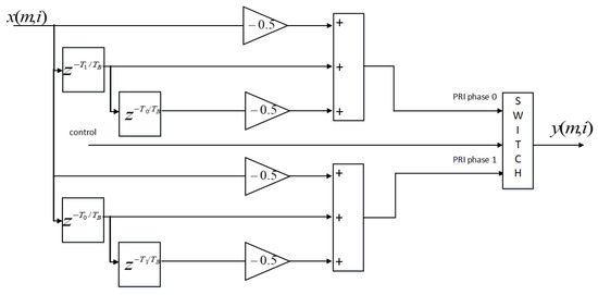 Switched implementation of the staggered pulse repetition interval (PRI) moving target indication (MTI) filter. The numbers and are indices of the RX antenna elements along the x and z axes (please refer to Figure 8 of [27]).