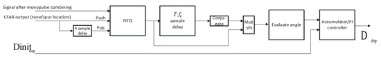 The Doppler estimation module uses the signal after monopulse combining , the CFAR detector output and the initial normalized Doppler parameter as the inputs. The block diagram is shown in Figure 7. The instantaneous Doppler estimation value can be estimated as: