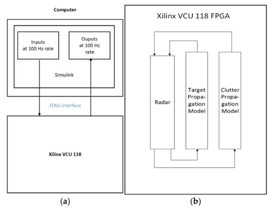 The tracking radar system and the proposed algorithm are implemented in MathWorks’ Simulink software. All the modules are carefully modeled in a 32-bit fixed point format. With the FPGA-in-the-loop capability of Simulink, this implementation is programmed on a Xilinx FPGA board (Xilinx Virtex Ultrascale + VCU 118 FPGA) and is interfaced with the computer that runs Simulink. Without the FPGA board, Simulink can simulate the radar transmitter, the line-of-sight RF propagation and the radar receiver in both floating points and fixed points. However, the simulation speed is usually slow. With the FPGA-in-the-loop configuration, as shown in Figure 8, the simulation speed can be improved significantly.