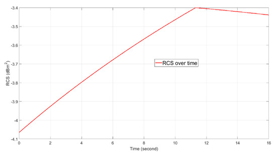 We show the simulation parameters in Table 2. Both the TX AESA and the RX DPA use a rectangular phased array, as illustrated in Figure 1. Based on the simulation parameters, the actual range resolution of the radar is 113.9 m using Equations (8) and (9). In addition, we illustrate the target RCS vs. time in Figure 9. Additionally, Chebyshev windows of length are applied before the FFT operations. The window function gives sidelobe suppression and causes an SNR loss of .