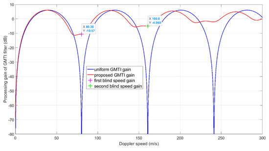 We first show the staggered PRI MTI filter gain vs. Doppler speed in Figure 10. With the uniform PRI MTI filter, the SNR drops near any integer multiples of the blind speed (the blind speed is about ) are significant. The first null of the uniform PRI MTI filter nulls the clutter signal. This property is retained by the proposed TPS-PRI-MTI design. The nulls of the proposed design at other blind speed points are significantly reduced. Near the second blind speed point (twice the blind speed), the loss is . Our simulation scenario happens in the second blind speed zone. The velocities in the, and axes are, and m/s, respectively, corresponding to m/s Doppler speed at time. The target moves into the second blind speed zone at m/s at a later time.