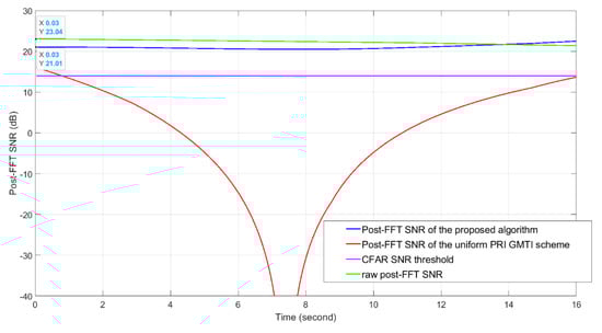 The blue curve shows the post-FFT SNR of the proposed algorithm. It considers the summation of the raw post-FFT SNR, the MTI filter noise enhancement of dB, the proposed staggered PRI MTI filter gain shown in Figure 10 and the slow time integration gain of dB. The red curve shows the post-FFT SNR of the uniform PRI MTI filter. It considers the summation of the raw post-FFT SNR, the MTI filter noise enhancement of dB, the uniform PRI MTI filter gain and the slow time integration gain of dB (since in this case, the PRI of uniform PRI MTI scheme (using only one-phase PRI instead of two) is about half of the PRI of the proposed scheme). Clearly, the proposed algorithm gives a much higher post-FFT SNR than the uniform PRI scheme. The post-FFT SNR of the proposed algorithm is about dB lower than the raw post-FFT SNR at time s. In Figure 11, near s, the SNR of the proposed algorithm even outperforms the raw post-FFT SNR due to the changes of the proposed MTI filter gain over time. Note that in this simulation setup, the target range increases over time because the target moves away from the radar. This causes an SNR decrease over time and offsets the RCS increase over time.