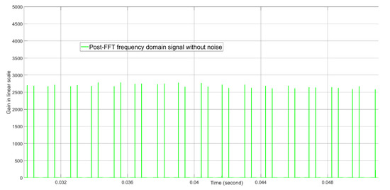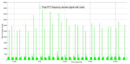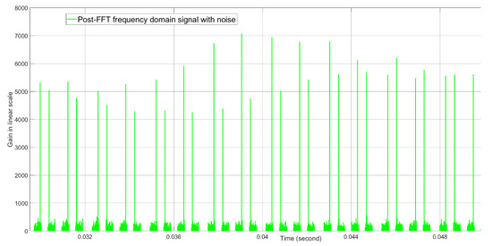 We illustrate the post-FFT SNR vs. time in Figure 11. The green curve shows the raw post-FFT SNR () defined in Equation (12).