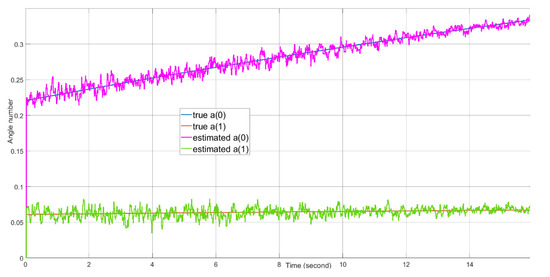 The FPGA-in-the-loop implementation uses the hardware description language (HDL) coder design methodology of MathWorks Inc. [43]. We can run the pure computer-based fixed point Simulink model (denoted by run A) and the FPGA-in-the-loop implementation (denoted by run B) concurrently. The outputs of the true values and the estimated values of the angle numbers, the range, the normalized Doppler and the velocities from both runs are compared against each other. We ran s of real-time data for run A and run B. The results of run A and run B are identical. Getting the results of run A is computer based. Run A is slow and it is only used for result comparison between run A and run B. With the confidence that the results of run B are identical to run A, we can run longer real-time data for run B. In the later simulation of run B (Section 4.3), we run 16 s of real time data and show simulation results there.
