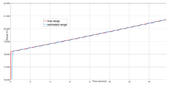 The inputs to the FPGA simulation are the target parameters, e.g., initial coordinates, initial velocities and accelerations for target modeling generated by the System Tool Kit (STK) software and the initial radar parameters as described in Section 2.2. The constants, like the carrier frequency, the speed of light, the radar PRI, etc., are directly used by the FPGA and are not considered as inputs. The outputs of the FPGA simulation are true values of the target, i.e., the target range, target velocities, target Doppler and target angels, and the radar estimates, i.e., the target range estimates, target velocity estimates, target Doppler estimates and target angle estimates. The inputs and outputs are all updated every 0.01 s of real time.