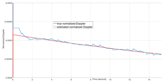 where stands for conjugate operation, is the tone index corresponding to where the CFAR detector output is Boolean value true and denotes evaluating the angle (in radians) of the quantity in the brackets. Equation (11) simply calculates the differential phase of at the tone location between the nth PRI and the th PRI, then normalizes the value by T, fB and 2π. The accumulator after evaluating is the classical proportional–integral (PI) controller (please refer to Figure 17 of [27] for an implementation of a proportional–integral (PI) controller), which takes the instantaneous Doppler estimation value and the initial Doppler parameter as the inputs and outputs the estimated Doppler value Ddop[n].