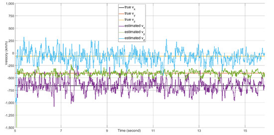 The velocity tracking performance over time. The velocity estimation formula follows Equation (37) in [27]. The estimation interval is 5 s. Therefore, this plot starts from 5 s.
