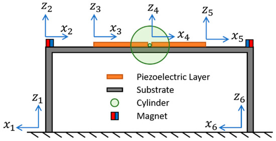 As shown in Figure 1, the proposed PEH is composed of a U-shaped beam, a pair of piezoelectric layers, a foam cylinder, and two pairs of magnets. The U-shaped beam structure comprises of a main beam and two side beams, which are fixed on the base. The piezoelectric layers are attached on the main beam symmetrically. The cylinder is attached to the center of the main beam to trigger VIVs. Two pairs of magnets are used to introduced non-linear repulsive force on the side beams. The PEH is modeled as a six-segment beam structure. The local coordinates of the PEH is depicted in Figure 2. The cylinder and the two magnets on the beams are assumed as point mass in the theoretical model.