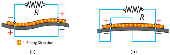 It can be found in Figure 3 that different modes result in different bending direction of the piezoelectric plates. Therefore, the two different modes required two different connection configurations to prevent voltage cancellation. The connection configurations are depicted in Figure 5.