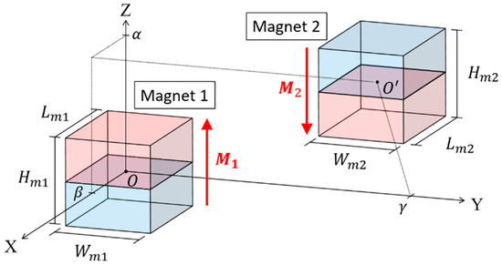 In this section, the repulsive force of the cubic magnets is derived. The model was developed based on Furlani’s model [32] of rectangular magnets. The schematic of a pair of cubic magnets is illustrated in Figure 7. Based on the charge model, the surface charge density can be expressed as: