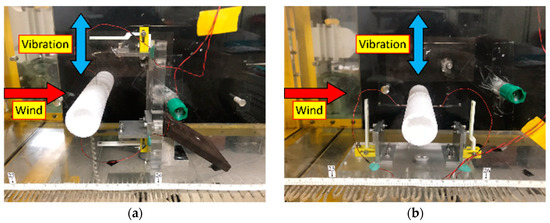 Setup of the proposed PEH installed in the wind tunnel for (a) horizontal mode, and (b) vertical mode.