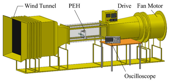 Figure 10 shows the platform for base excitations. The PEH was installed on a shaker (LDS-V406), which was controlled and driven by a vibration controller (UCON VT-9002) and a power amplifier (LDS PA-100E). An accelerometer (PCB 352C66) was used to detect the acceleration of the shaker and send a feedback signal to the controller for closed-loop control. The displacement of the PEH was acquired by a laser displacement sensor (Mti LTS-120-40) and the voltage output was obtained by an oscilloscope (Keysight DSOX4042A). The damping ratio was obtained in the base excitation tests with the acceleration of 0.05 G. The PEH was then tested in a wind tunnel (LonGwin LW-9300S) for VIVs. The schematic of the wind tunnel tests can be seen in Figure 11.