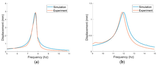 Displacement responses in short circuit under base excitations in (a) horizontal mode, (b) vertical mode.